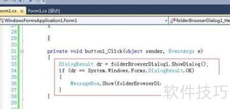 6、 双击按钮后,进入该按钮的后台点击事件处理程序,并添加相应的代码。首先通过DialogResult dr = folderBrowserToolStripMenuItem.ShowDialog();语句调用系统文件夹浏览对话框,用于让用户选择目标路径。随后使用条件判断语句if (dr == System.Windows.Forms.DialogResult.OK)检查用户操作结果,确认是否点击了确定按钮完成路径选择。若判断成立,表示用户已成功选定一个文件夹,则通过消息框将所选路径显示出来,具体实现为执行MessageBox.Show(folderBrowserToolStripMenuItem.SelectedPath);语句,弹出提示窗口,内容为用户在对话框中选取的完整目录路径。该流程实现了文件夹选择与路径反馈的基本交互功能,便于后续对指定目录进行读取或写入等操作。整个过程简洁直观,适用于需要用户手动指定路径的应用场景。