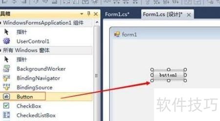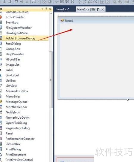 1、 在WinForm项目中,打开工具箱,找到FolderBrowserDialog控件并将其拖拽至窗体界面,此时系统会自动在窗体上创建一个名为folderBrowserDialog1的实例对象,供后续代码调用和属性设置使用。