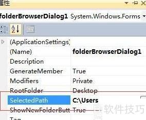 3、 在folderBrowserDialog1的属性面板中,可调整各项属性并设置相应的事件处理方法。