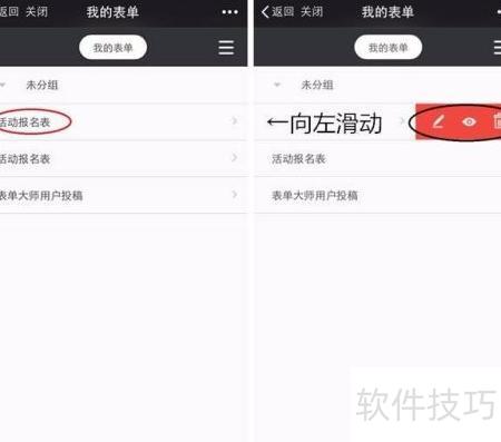 13、 在我的表单-表单列表页面,长按表单名称并向左滑动,即可显示编辑、查看和删除选项,点击所需功能按钮完成操作。
