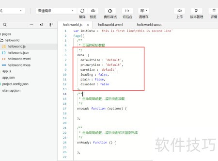 4、 在JS文件中设置按钮组件各属性数据绑定所用变量的初始值。