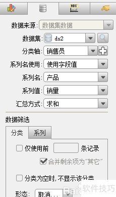 10、 选中柱形图后,将其数据源更改为新建的ds2数据集,分类轴保持为销售员,系列名称改为产品,系列值仍为销量,具体设置所示。