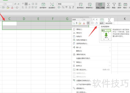 2、 先选中表头的两列区域,点击鼠标右键,在弹出的菜单中选择合并居中功能完成操作。