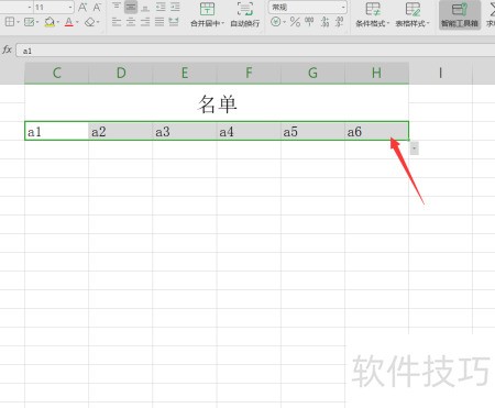 4、 向右拖动填充,可看到A1至A6单元格自动完成填充。