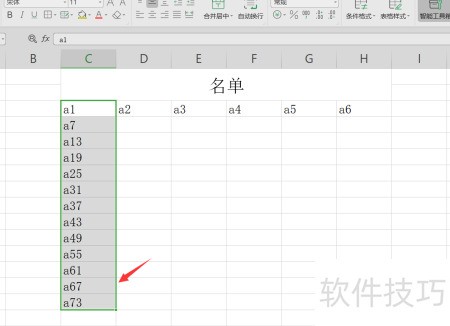 5、 在第二行输入a7后,向下自动填充,可观察到内容从a1连续填充至a73。