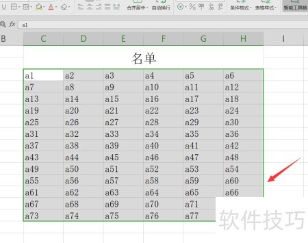 6、 选中这两行两列后,向右下方拖动填充,即可自动将数据填满从A1到A78的所有单元格。