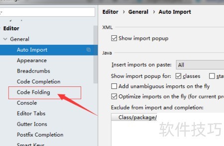 4、 在设置界面左侧找到并点击代码折叠选项。