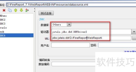 4、 重启设计器后,进入服务器菜单,选择定义数据连接功能。点击新建JDBC数据连接,在数据库类型中选择others。在驱动类名称栏输入jstels.jdbc.dbf.DBFDriver2,然后在URL地址栏手动填写jdbc:jstels:dbf:D:/FineReport/WebReport/,此路径需指向实际存放dbase数据库文件的目录位置,确保路径正确无误,最后保存设置即可完成连接配置。