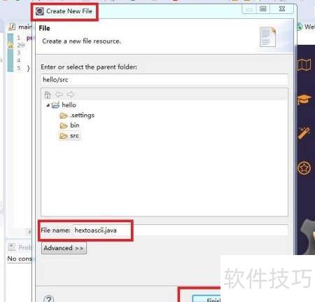 2、 在弹出的新建文件对话框中输入文件名,确保后缀为.java,然后点击完成按钮,具体操作所示。