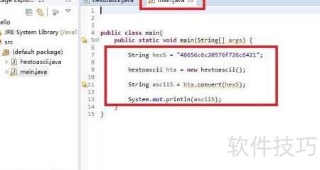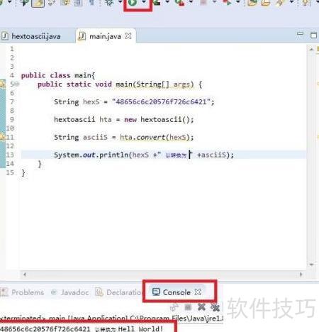 5、 五、点击Eclipse的运行按钮,若在控制台窗口中显示出对应的信息,则说明已成功为Eclipse中的Java项目添加了十六进制Hex转换为ASCII的功能,具体效果所示。