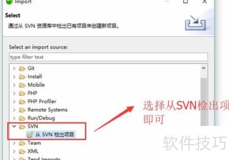 8、 在导入界面中,若出现从SVN检出项目的选项,说明SVN已安装成功,具体所示。