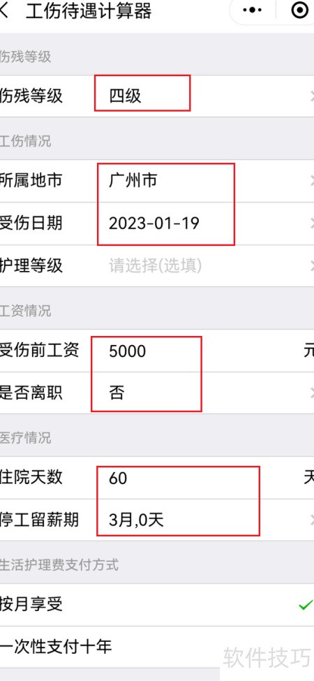 2、 输入工伤信息后点击计算按钮