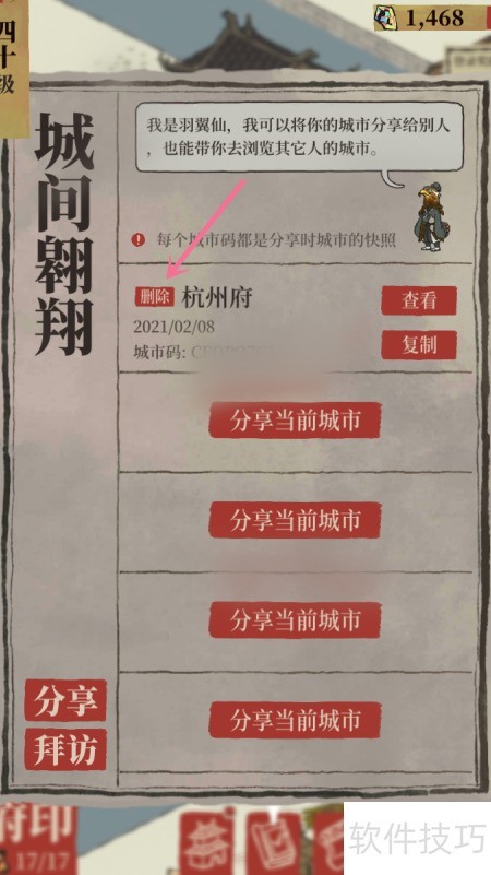 4、 创建分享城市后,进入城间翱翔页面,选择已建城市点击删除即可。