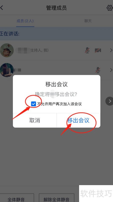 6、 弹出移出确认窗口,勾选禁止用户再次参会选项。