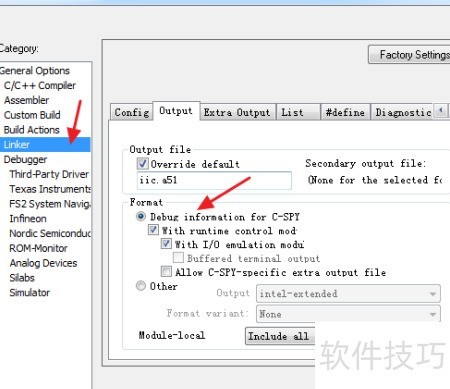 3、 跳出工程设置界面后,进入Linker选项,找到C-SPY的调试信息设置,勾选对应复选框,确认并关闭窗口,操作所示。