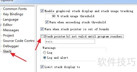 5、 在弹出的窗口中,选择Stack选项,并取消勾选Stack pointer(s) not valid until program reaches的设置,具体操作所示。