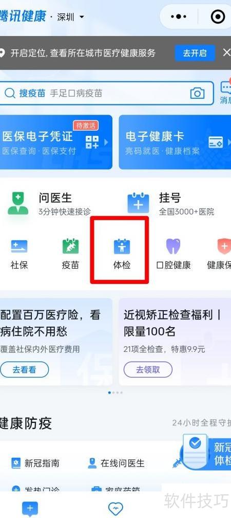 1、 打开微信医疗健康小程序首页,点击体检选项进入。
