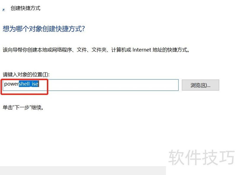 15、 在弹出的输入框中键入 powershell_ise.exe,随后点击下一步;实际操作时,也可直接输入 powershell_ise 来完成创建过程。