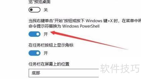 9、 在右侧窗口中找到通过右键单击开始按钮或按下Win+X时,将菜单中的命令提示符替换为Windows PowerShell选项,将其下方的开关切换至开启状态即可完成设置。