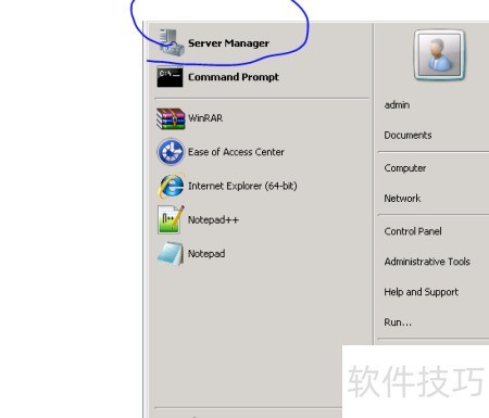 1、 先点击开始菜单,再选择服务器管理器即可。