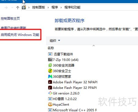 5、 在程序与功能界面左侧,选择启用或关闭Windows功能选项。