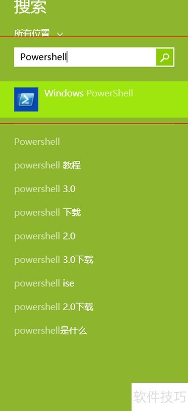 2、 在Win7或Win8.1系统中,按下Win+Q键启动搜索,输入PowerShell后,点击出现的提示选项即可打开。