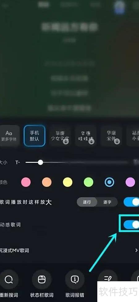4、 开启动感歌词功能,即可体验动态歌词效果。