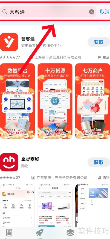 2、 在顶部搜索栏输入营客通并点击搜索。