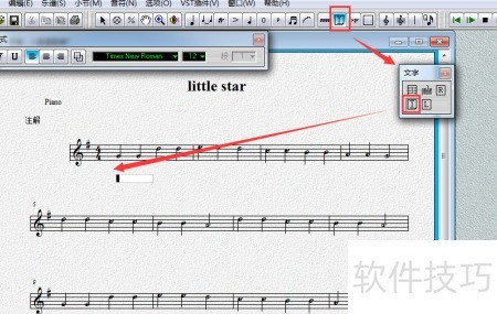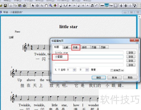 11、 修改乐谱时,双击标题,在第二行添加小星星,点击右侧按钮调整字体和字号,使其与第一行一致,可先点击第一行右侧的选项查看原有格式设置。