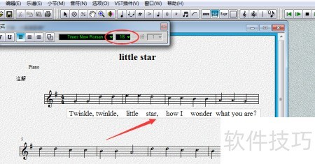 7、 默认字体搭配18磅字号较为适宜,具体需参照原歌谱格式。调整完毕后,即可开始输入中文歌词内容。