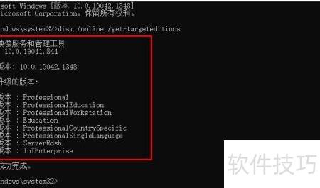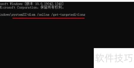 2、 输入 dism /online /get-targeteditions 命令后按回车键执行。