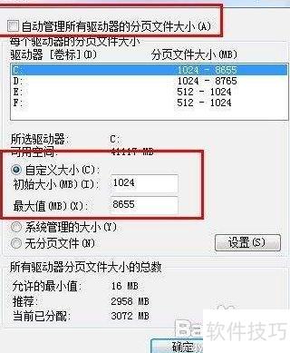5、 取消勾选自动管理所有驱动器的分页文件大小,选择目标盘符后设定自定义大小,推荐初始值为512MB,最大值设为2048MB。