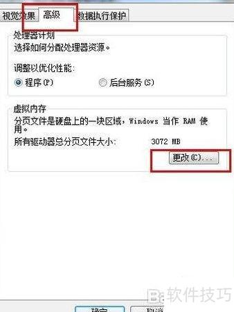 4、 进入性能设置,选择高级,点击虚拟内存并进行修改。