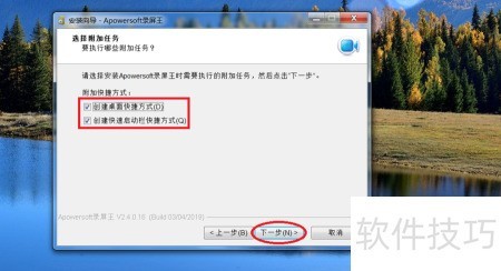 5、 在桌面上创建录屏王快捷方式,并将其添加到开始菜单,完成后点击下一步。