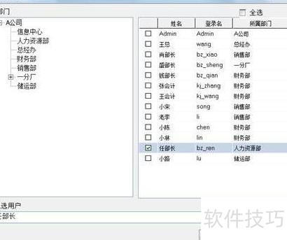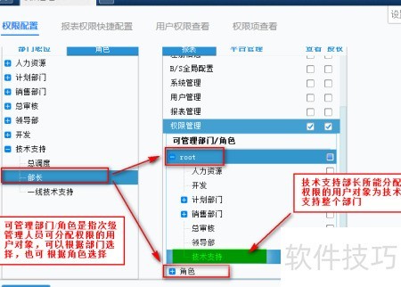 28、 在完成技术支持部长职位的报表与管理平台权限配置后,接下来需设定该用户可向下分配权限的具体人员。