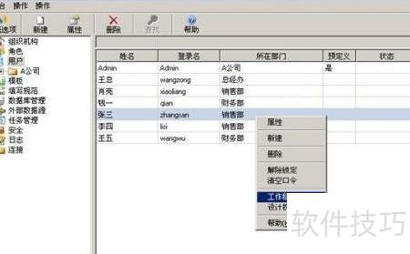 13、 以系统管理员或张三所在部门的管理员身份登录管理控制台,点击用户节点,右侧将显示用户详情。右键单击张三,在弹出菜单中选择工作移交即可完成操作。