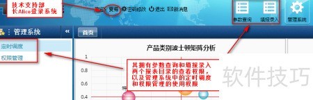 30、 退出当前系统后,使用技术支持部长Alice的账号登录,可查看到该角色具备参数查询、填报录入、定时调度及权限管理等功能的访问与操作权限,具体所示。