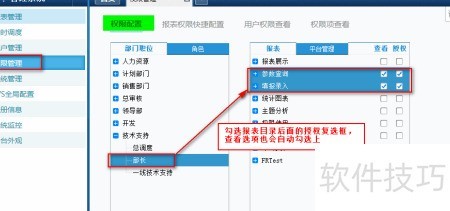 26、 为技术支持部长配置权限时,进入权限配置中的部门职位选项,选择技术支持下的部长职位。在右侧权限列表中,勾选报表模块的参数查询与填报录入授权项,系统将自动启用查看权限。同时,在平台管理中选中定时调度、权限配置的查看及授权选项,完成相应设置。