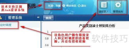 34、 退出当前系统后,使用技术支持总调度Jack的账号登录,可见该用户仅具备填报录入与定时调度的查看权限,无任何授权操作权限。