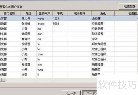 13、 批量创建用户的方法与创建部门类似。需先将所有用户信息整理并录入Excel文件的第一个工作表中,共九列:部门名称、姓、名、姓名、登录账户、手机、电子邮件和角色。随后按照指定步骤依次操作即可完成批量创建。
