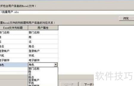 16、 打开批量导入用户窗口,点击选择已准备好的Excel文件,将文件中的列标题与用户属性下拉选项逐一匹配,确认无误后点击继续操作。