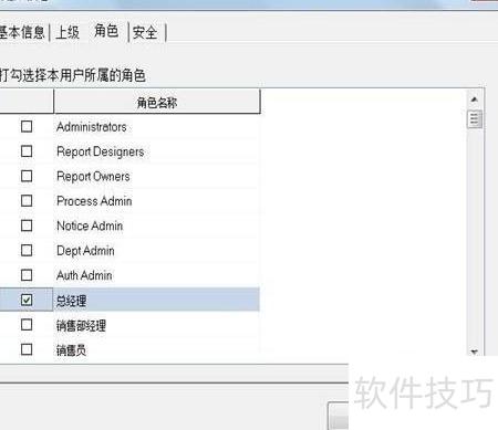5、 在角色标签页中勾选总经理,确认新用户担任该职务。
