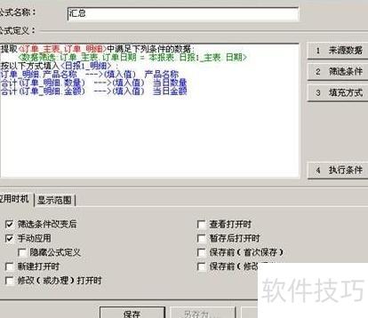 6、 创建表间公式,命名为汇总,并设置为在筛选条件变更后自动运行及支持手动执行。