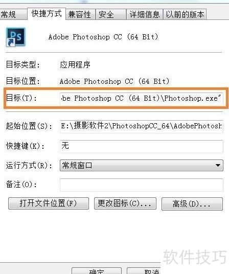 10、 首先确定Photoshop的安装路径。操作方法是:在桌面找到Photoshop图标,点击右键,选择属性。随后会弹出一个设置窗口,在目标一栏后的文本框中,即可看到软件的具体安装位置。该路径即为程序所在文件夹的地址。