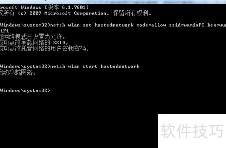 8、 在命令提示符中继续执行:netsh wlan start hostednetwork,以启动虚拟无线网络。