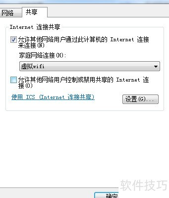 12、 在网络连接窗口中,右键点击已联网的连接,进入属性中的共享选项,勾选允许其他用户通过此计算机的Internet连接来连接,并在下拉菜单中选择虚拟WiFi。