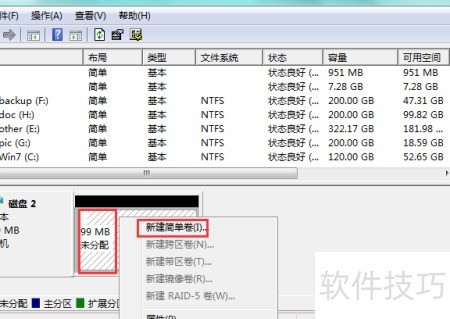 3、 右键点击磁盘区域,选择新建卷操作。