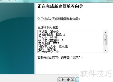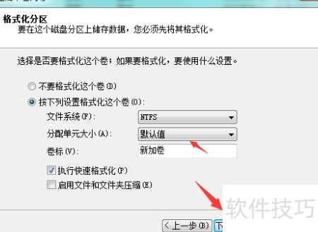 7、 选择新建卷的磁盘格式,确认后点击下一步。