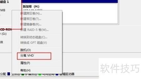 16、 右键点击虚拟磁盘,选择分离VHD,在弹出窗口中按需勾选是否删除虚拟硬盘文件。