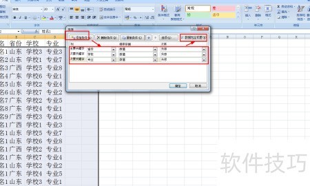 3、 先将B列设为主要关键字并按数值升序排列,再添加C列和D列为次要关键字,最后勾选数据包含标题选项完成设置。
